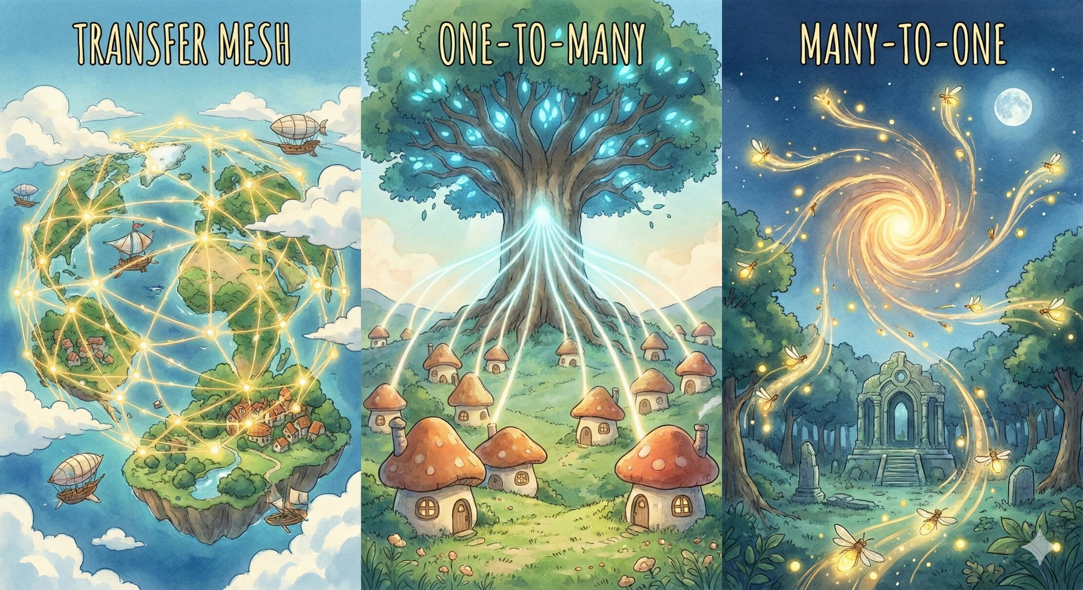 N-to-N Distributed Topology – True many-to-many architecture allowing decoupled, asynchronous data exchange across the entire fleet.Parallel Distribution – Single-source ingress driving concurrent egress streams to $N$ destinations with optimized thread allocation.Concurrent Data Ingest – High-throughput accumulation from distributed edge nodes to a centralized data lake or master server.Mesh Network Capability – Enables the construction of a self-reinforcing transfer grid, maximizing availability and throughput for complex distributed systems.